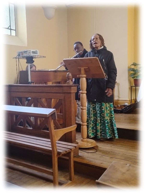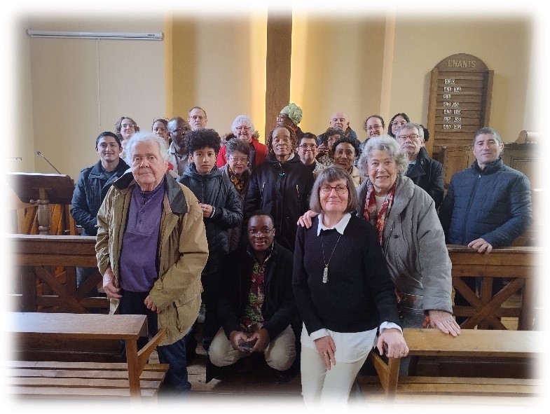 Accompagnée au piano par sa belle-fille Nadège, et à la flute traversière par son fils Espoir, Jacqueline nous a fait passer un moment de dépaysement avec son chant de louange dans sa langue maternelle. Jacqueline est repartie au Bénin après un court séjour pour rendre visite à sa famille mais surtout pour profiter de sa petite fille Lucile née en octobre dernier. Nous remercions cette famille très talentueuse. Plus tard, ce sera à Lucile de nous entonner un cantique pour louer le Seigneur ! »
